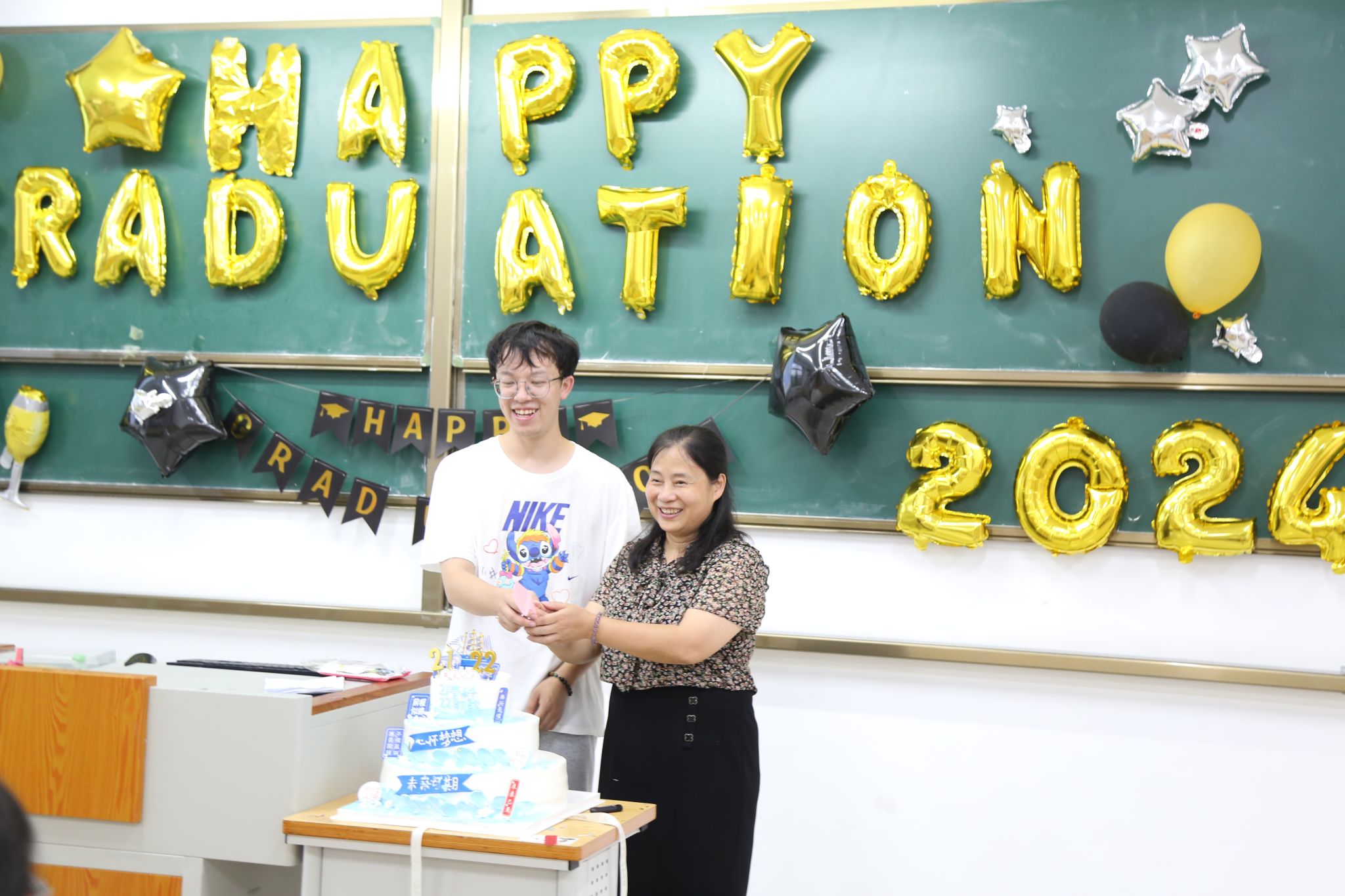 在互动环节中,师生们亲切交流,大家畅所欲言,分享自己的感受和心得体会,现场气氛温馨融洽。晚会现场还播放了同学们对毕业生的祝福视频,视频中传来了同学们对毕业生的声声祝福。视频播放结束后,师生共同切蛋糕,由陈兵书记和毕业生代表陈嘉鑫同学共同切下第一刀,蛋糕上写有“心怀梦想、未来可期”的字样,充满了对毕业生的美好祝愿。