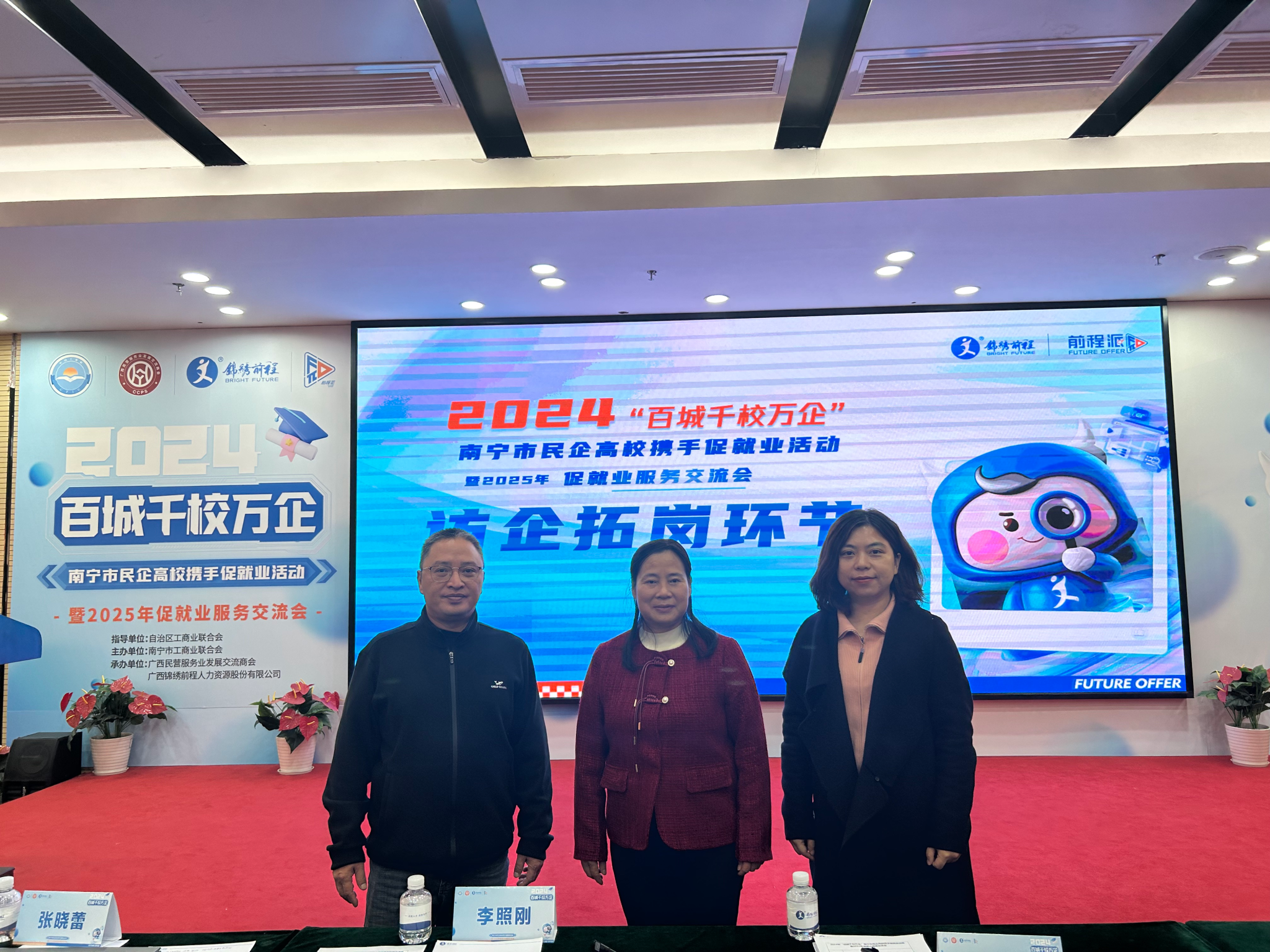 为了更好的深化与企业的合作,12月18日下午,beats365参加2024百城千校万企南宁市民企高校携手促就业活动暨2025年促就业服务交流会。本次交流会由南宁市工商业联合会主办,广西民营服务业发展交流商会、广西锦绣前程人力资源股份有限公司承办。公司党委陈兵书记、黄宇副书记,负责就业工作的辅导员共同参加了本次交流会。现场共有17家参会企业参加了本次促就业交流会。