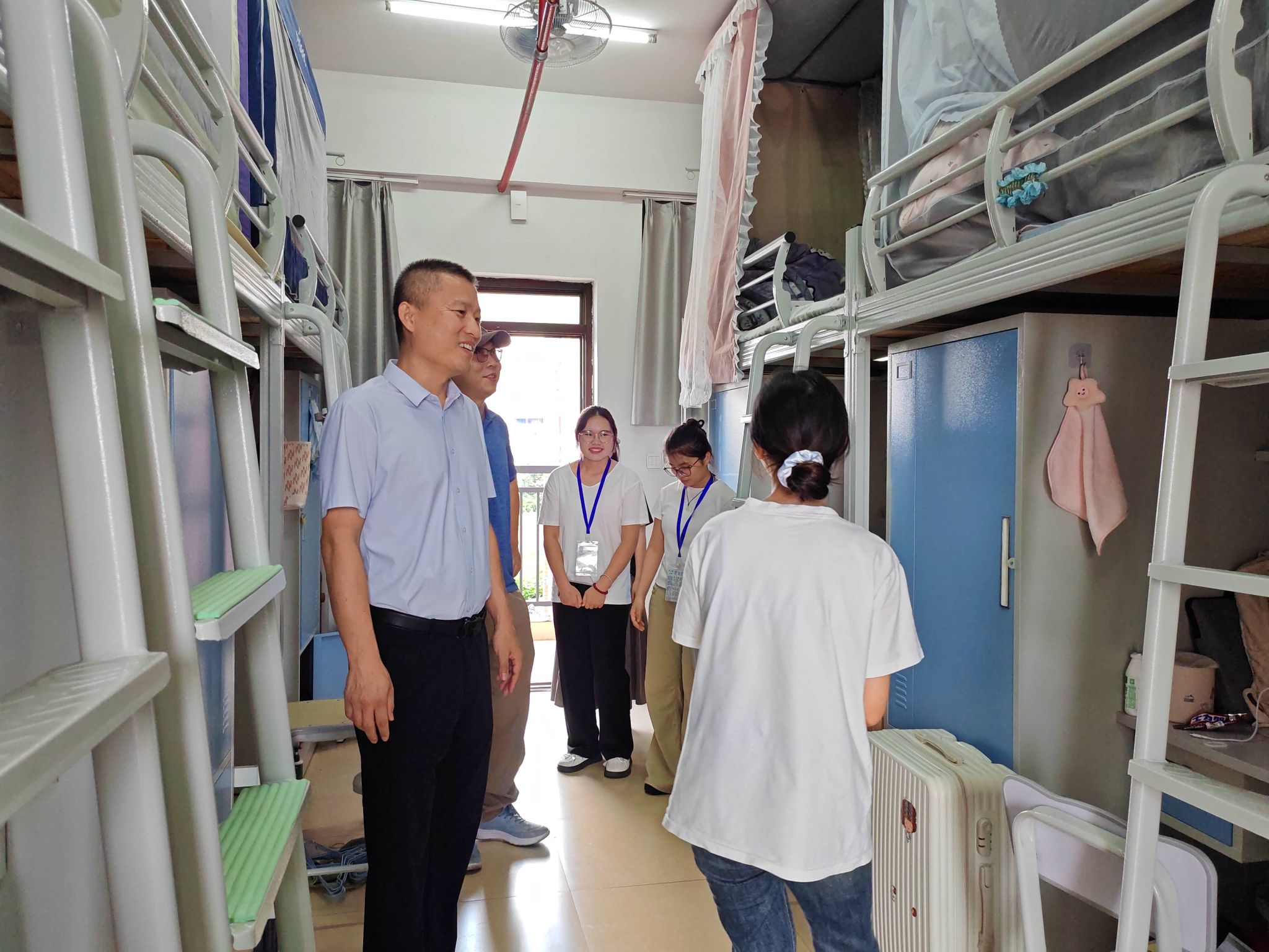 下午,公司党委书记陈兵、经理汪德荣、副书记黄宇、副经理刘新全、黎英、蔡宏果及经理助理李梅等全体领导,率辅导员、班主任及员工干部一行,深入走访了新生宿舍,亲切看望刚刚入校的同学们。走访期间,领导们细致察看了新生住宿环境,详细了解同学们的到校情况,并与大家亲切交流,细心询问每一位同学的家乡和初入大学的感受。他们叮嘱新生要增强安全意识,注重彼此包容与合作,努力营造和谐融洽的宿舍氛围。整个交流过程温馨而愉快,有效搭建起了师生之间暖心沟通的桥梁,为新学期的开启注入了温暖的底色。