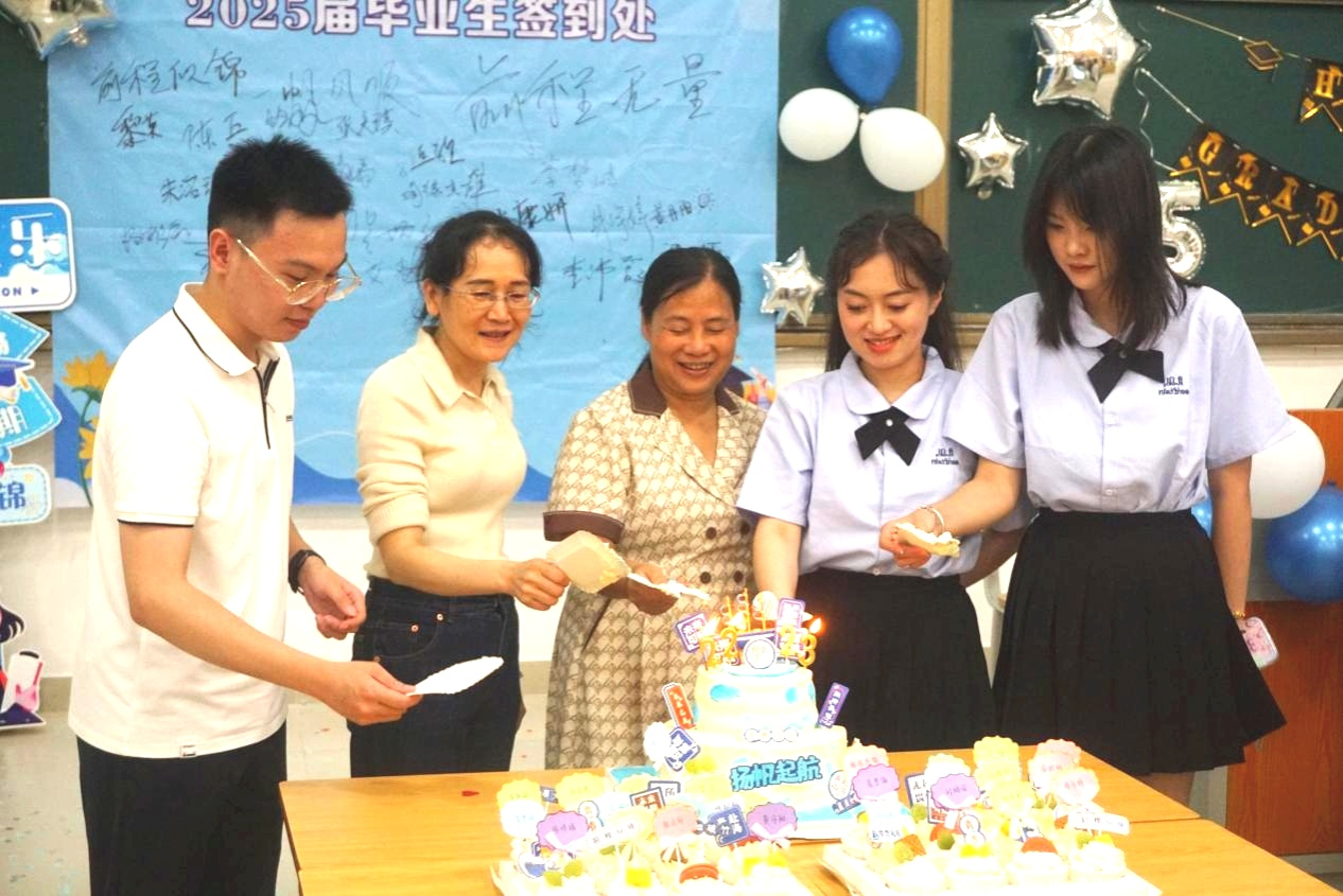 晚会尾声,师生共切“毕业快乐,扬帆起航”主题纪念蛋糕,并合影留念。